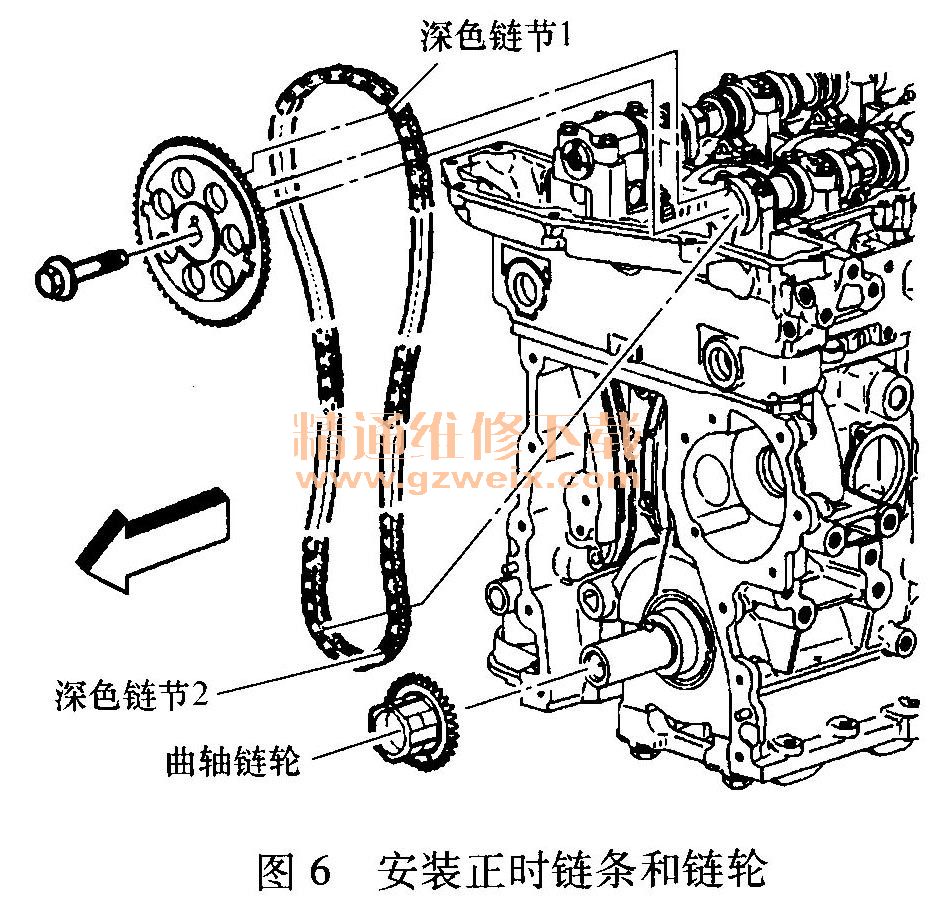 14)确保正时链条上的深色链节必须与各个链轮上的正时标记对齐,见图12。