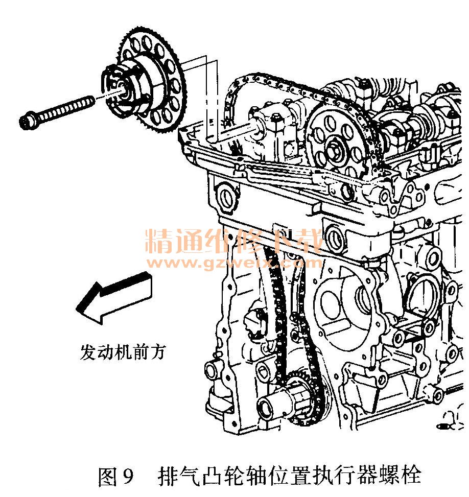 11)按照图9所示,换装新的排气凸轮轴位置执行器螺栓,将螺栓紧固至25N·m,然后再将螺栓拧紧135°。