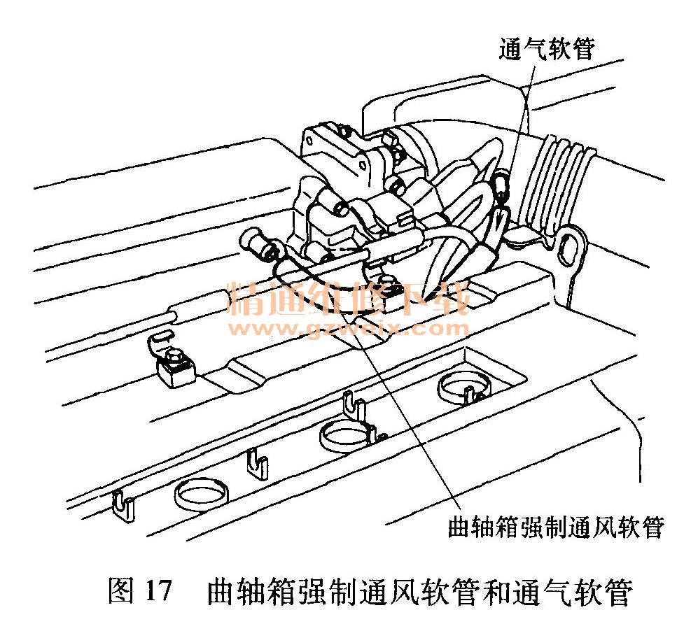 ③如图17所示,拆卸PCV(曲轴箱强制通风)软管和通气软管。