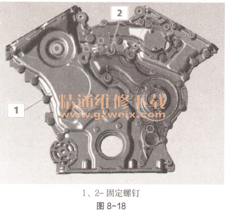 (16)拧下发动机缸体上盖子的固定螺钉(如图8-17中1)和(如图8-17中2),然后将调速系统前盖从其原位移除。
