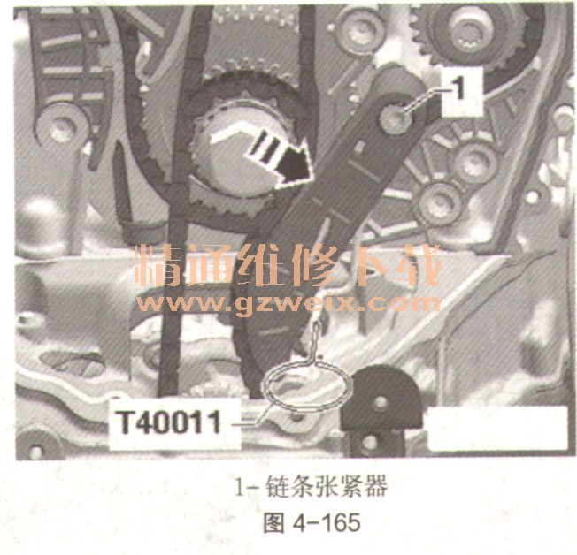 用定位销T40011固定链条张紧器,如图4-168。