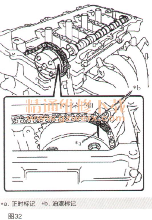 (4)抬升链条分总成,将正时标记和油漆标记对准,并将凸轮轴安装到凸轮轴壳分总成上,如图32所示。