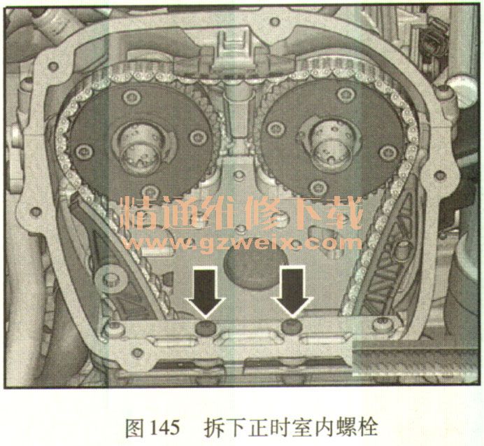 7)沿箭头方向压机油泵的链条张紧器并用定位销T40011固定。