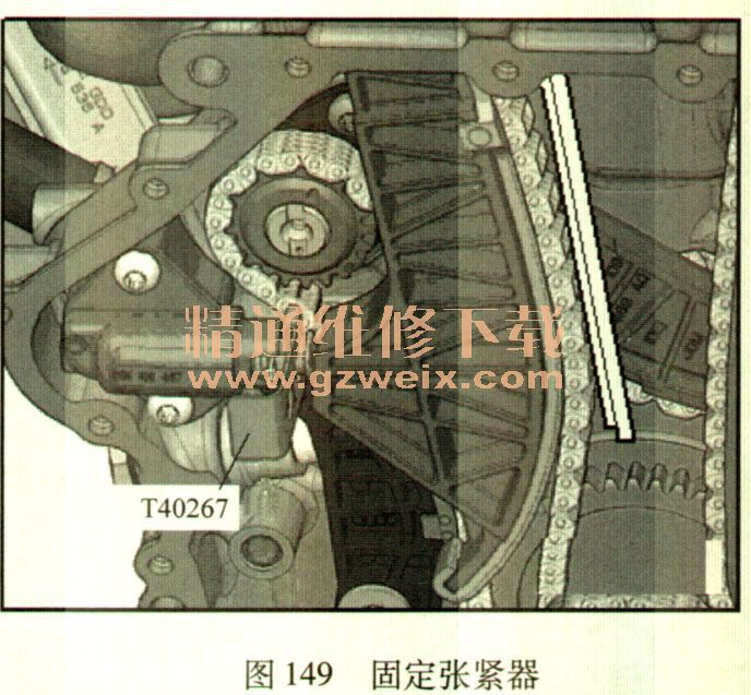 18)链条张紧器用定位工具T40267固定,如图149所示。