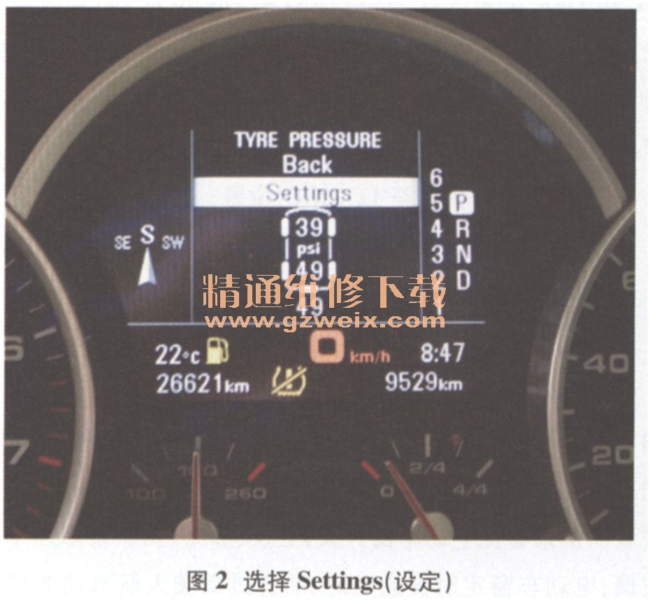 (2)按转向盘右侧组合开关上的MENU键,调出系统设置主菜单(图1),并选择“Tyre press”(轮胎压力),按OK键。