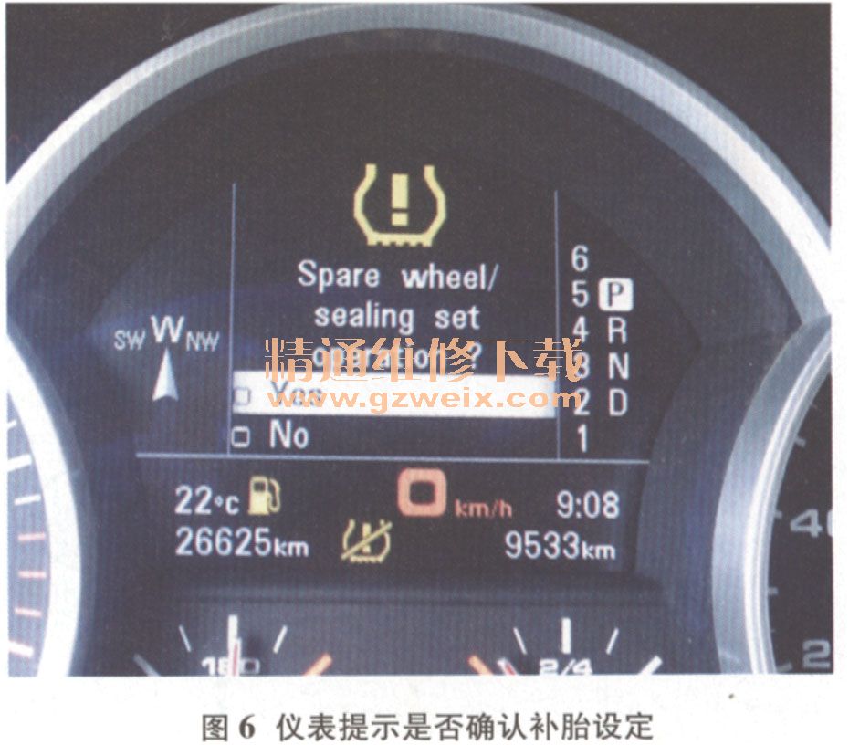 (7)起动车辆,行驶数分钟,仪表出现图6所示的提示(是否确认补胎设定),选择“Yes”,成功设定轮胎压力。