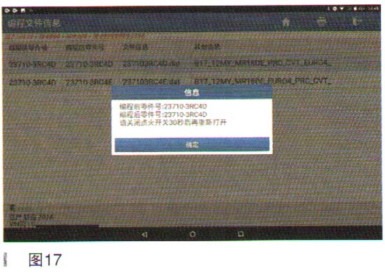 15.点击“确定”后,出现编程前后零件号,如图17所示;点击“确定”,完成编程功能;编程完成后需要根据车辆的故障情况执行对应的设码,