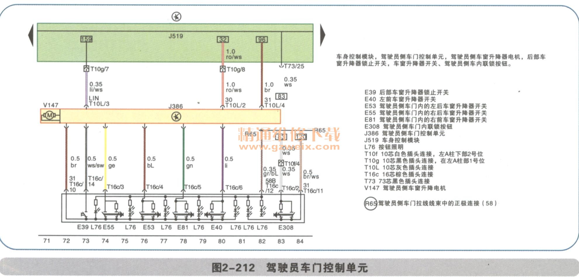 驾驶员侧车门控制单元J386的T10L/2脚为来自地址码32的常电源;T10L/4脚为接地;T10L/3脚为信息传输线LIN线,与其他车门控制模块和J519相连;升降器开关总成T16c/10脚与J386相连,通
