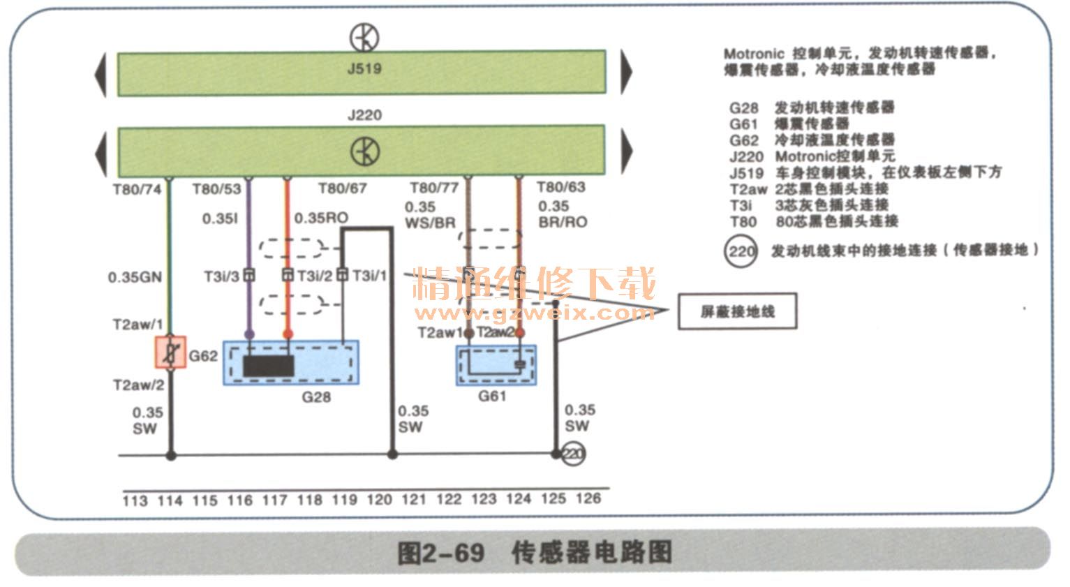 转速传感器G28又称为曲轴位置传感器或者曲轴转角传感器,如图2-66所示,其功用是采集曲轴转动角度和发动机转速信号,并输入电子控制单元J220,以便确定点火时刻和喷油时刻。源传感器,两线与J220的T80/53和T80/67脚连接。