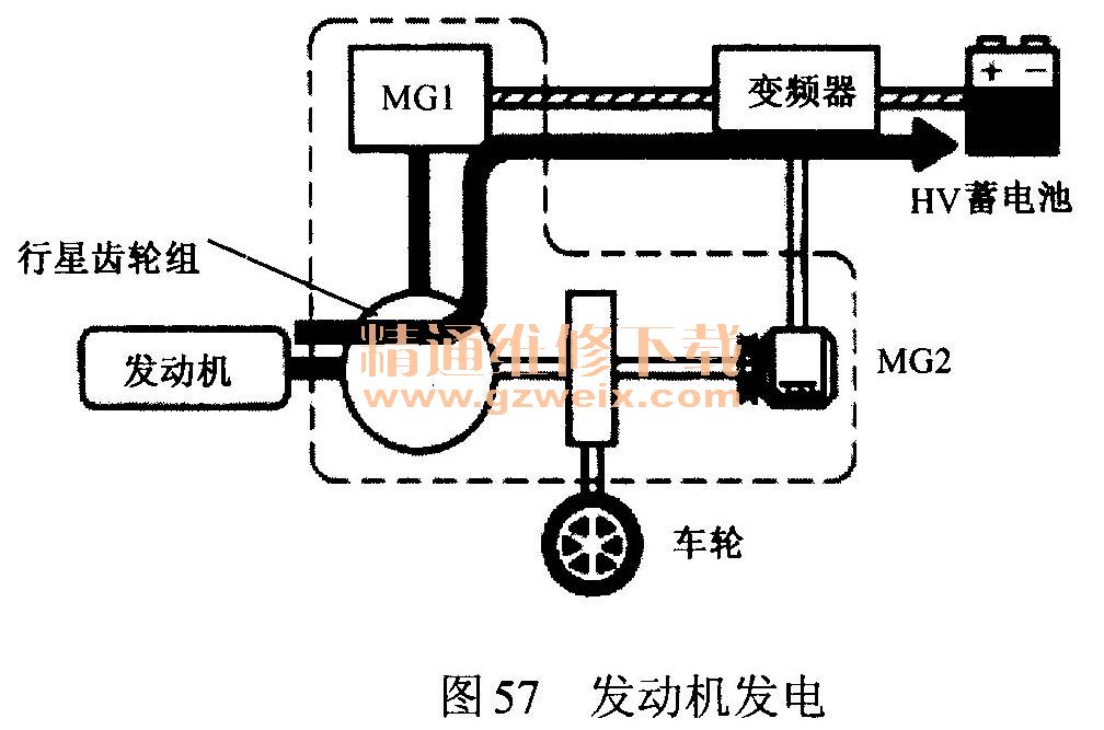 (3)发动机通过行星齿轮带动发电机(MG1)旋转,给HV蓄电池充电,充电过程如图57所示。