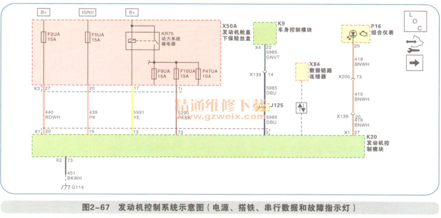 KR20D冷却风扇高速继电器保持断电,因为发动机控制模块端子X2 15没有搭铁。