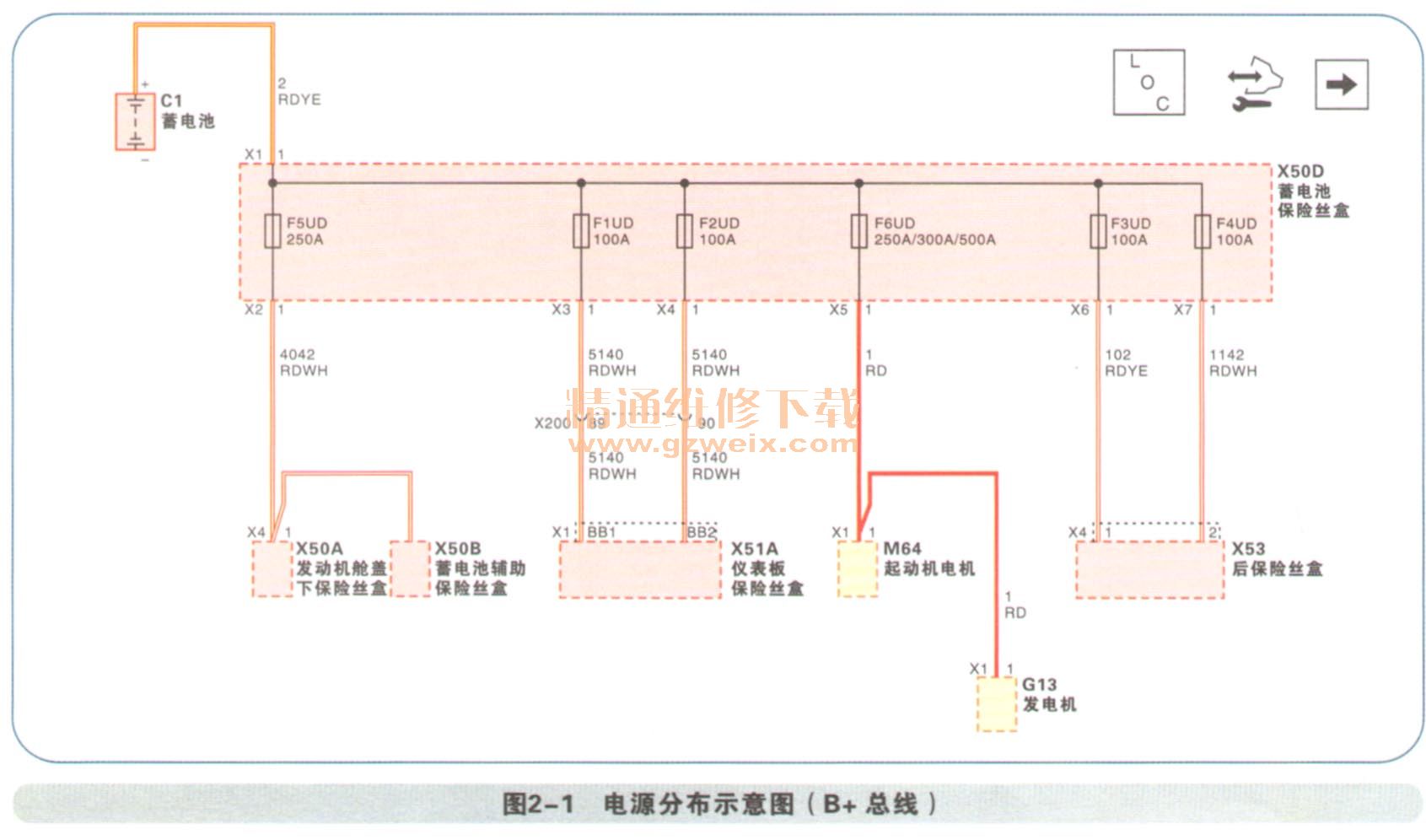 F5UD→发动机舱盖下保险丝盒(X50A),蓄电池辅助保险丝盒(X50B FIUD、F2UD。仪表板保险丝盒(X51A);