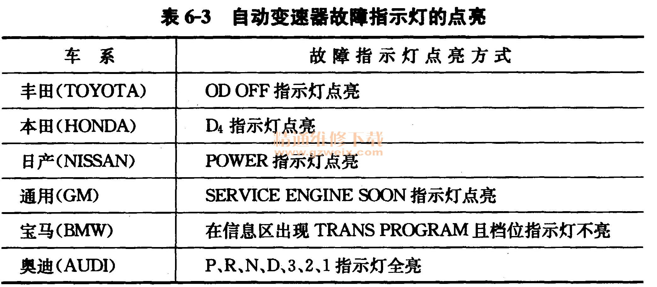 如果自动变速器电控系统出现故障,黄色的故障指示灯(MIL)会点亮,但不同车系点亮的方式不同,具体情况见表6-3。