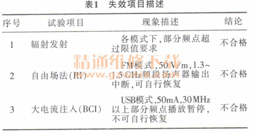 按照上述试验项目,分别对选定的各种工作模式进行考核。对于娱乐系统而言,其内部如高频头、解码芯片属于敏感设备,而USB高速通信线、大量的晶振又属于骚扰源,因而整体表现兼具敏感设备和骚扰源的特点。需要从骚扰特性和抗干扰特性两方面进行研究。发生失效的项目如表1所示。