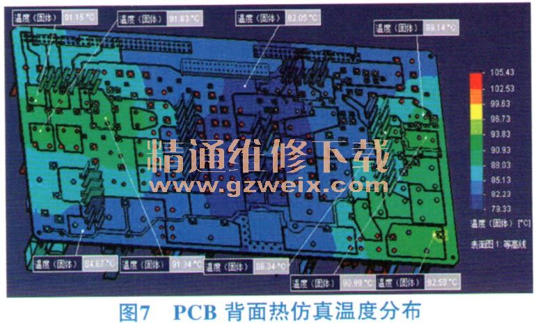 图6和图7分别为PCB正面和背面热仿真温度分布结果。