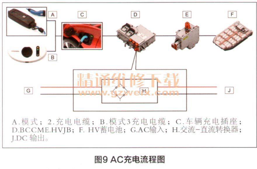 AC充电流程图如图9所示。在连接至AC电源时,BCCM将AC电压转换为DC电压,为HV蓄电池进行充电。车辆支持最高电压240V和32A电流的单相AC充电。使用模式2或模式3充电电缆时可支持最高为7kW的充电率,电源转换由BCCM来执行,这被称为车载充电。虽然可以将三相AC电源连接至车辆,但是因为BCCM仅支持单相充电,所以实际充电率可能会低于预期。例如,如果连接了一个11 kW的3相电源,则车辆将会仅使用该电源的一相,以约3.6kW的功率进行充电。