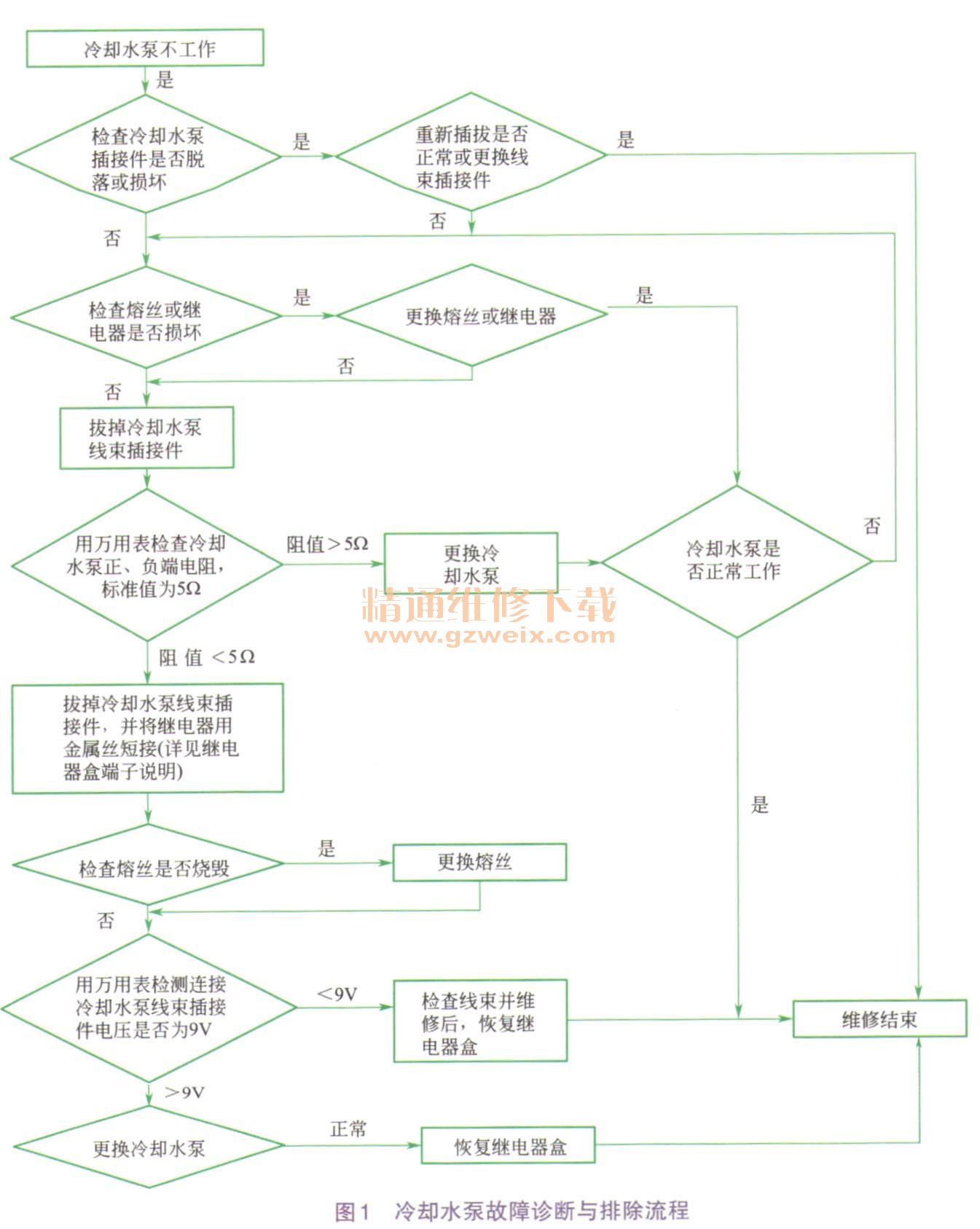 冷却水泵不工作可导致冷却液无法在冷却系统中流动,从而造成高压系统过热。冷却水泵故障诊断与排除流程如图1所示。