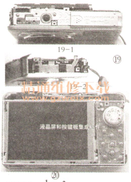 5.把相机反过来,将图20所示的液晶屏和按键板集成组件,盖到CCD组件和主板上面,连接图21-1所示虚线框1、2中的液晶屏、按键板与主板的排线,固定图中和图21-2实线框中的螺丝。