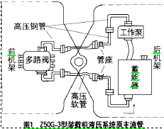 如图1所示, 该型装载机液压系统的进油管和回油管均由3根高压钢管和1根高压软管组成 " 工作泵安装在后机架变速器上, 多路阀安装在前机架上 " 进油管连接工作泵出油口与多路阀进油口,回油管连接多路阀出油 口与液压油箱 "由于装载机前、后机架是铰接连接的,为便于装载机转向和摆动 , 其铰接部位使用高压软管连接; 而前、后机架部位使用高压钢管连接。