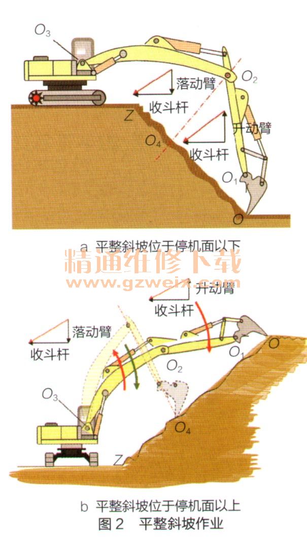 反铲挖掘机平整地面是一种常见、频繁和必不可少的作业项目。单.独操纵挖掘机工作装置任意1个动作时,挖掘机斗齿尖的运动轨迹均为弧线形,均无法实现平整地面作业,因此无论是平整地面作业,还是平整斜坡作业,应采用复合动作方法。