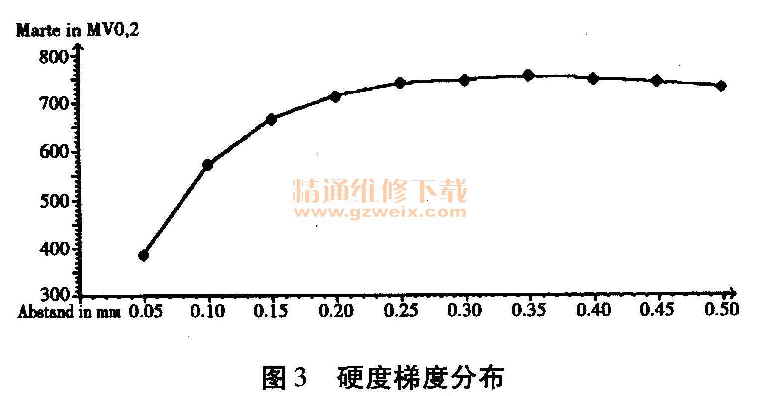 在这种情况下,磨削热的积累进一步使得加工工件的温度升高到材料的回火温度,此时从金相上可以明显的看出回火区域,如图2所示;同时从磨加工表面开始测量零件的硬度也可明显看到硬度的梯度分布,如图3所示。