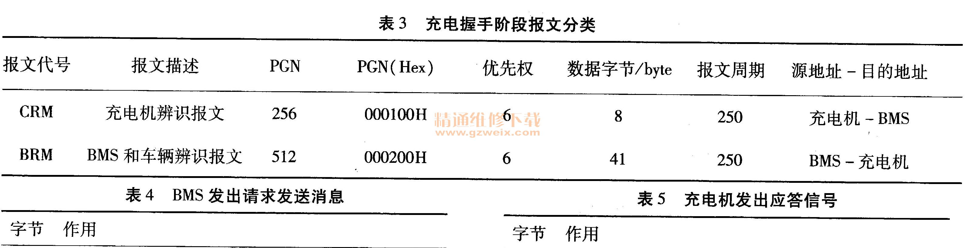 当BMS和充电机物理连接完成并上电后,BMS和充电机进入握手阶段,握手阶段报文分类如表3所示。