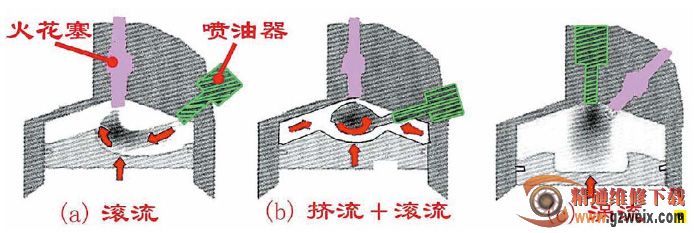 结构见图6(a)。喷油器侧置,火花塞中置,以独特的活塞结构及配气系统配合,使汽缸内形成滚动气流,使油雾运动到火花塞附近被点燃,其它区域是稀混合气甚至是纯空气。