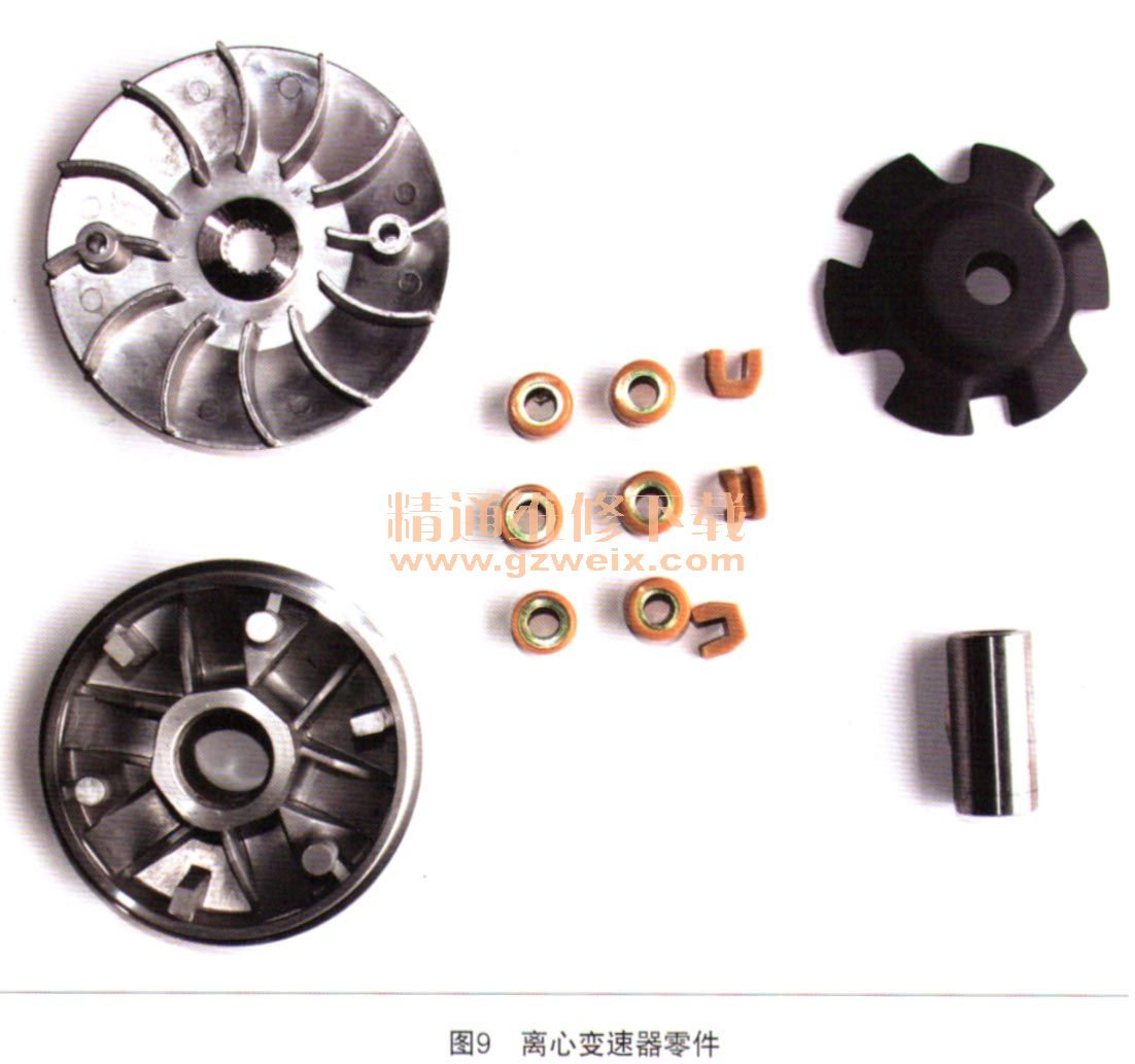 b)滚珠。6个小小的滚珠看上去微不足道,安装在主动轮6个轨道槽内,可随发动机转速的变化沿轨道滑行,推动主动轮轴向移动,通过改变主动轮的工作半径来改变传动比。