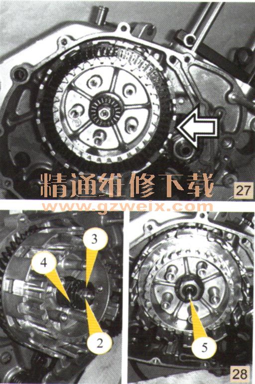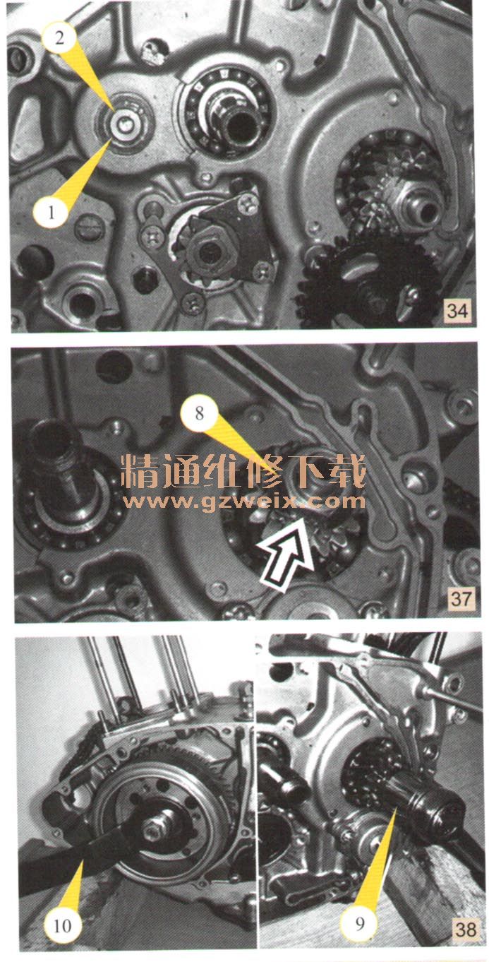 d)拆卸离合器盖①,如图25所示。夹紧磁电机转子固定螺栓,按对角线拆卸离合器弹簧盘装配螺栓,而后拆卸离合器弹簧和离合器弹簧盘,如图26所示。拆卸离合器主动摩擦片和从动片,如图27所示。拆卸顶杆②、垫圈③、轴承④和推杆⑤,整平离合器花键套熔丝垫圈,如图28所示。拆卸离合器花键套螺母①,使用离合器套夹②拆卸离合器花键套③,如图29、图30所示。拆卸推力垫圈④和离合器大毅组合⑤,如图31所示。拆卸推力垫圈⑥和衬套⑦,如图32所示。拆卸变挡轴⑧,如图33所示。