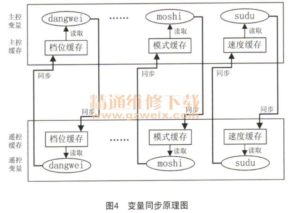 信号的无线回传通过变量同步的方法实现。变量同步即是主控系统与遥控系统双方彼此定义相同的变量与相同的变量缓存区,在需要收发信号时通过传递变量值到对方缓存区,通过读取缓存区的值并赋值给变量完成该信号的同步。同步如图4所示。