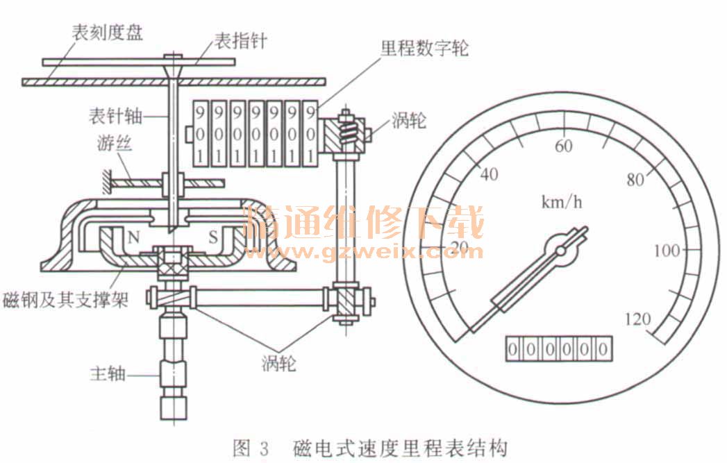 (3)机械式 采用机械里程表,前轮有一个里程涡轮,受前轮带动,继而拨动传动软轴线来带动速度表显示速度,这种方法显示的速度一般是准确的。其结构如图3所示。