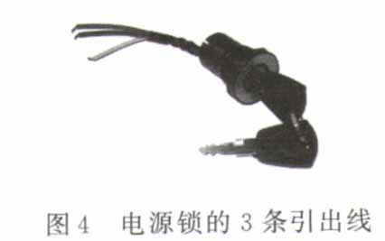 电源锁出厂时设置有2个挡位,K1和K2挡位,它有3条引线,分别是红线、黄线和蓝线(或白线),其中红线是电源锁进线,黄线和蓝线(或白线)是电源锁输出线。电动摩托车款有多条引线,但只用了其中两条。电源锁的3条引出线如图4所示,电源锁的电气原理如图5所示。