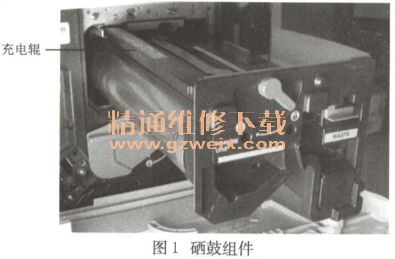 从原理上看,如果硒鼓没有充电,硒鼓本身带有正电荷,经过激光照射,无论是否照射,硒鼓的全部图像区都带有正电荷,这样碳粉图层辊的负电荷碳粉就会全部吸附到硒鼓上,从而造成整张打印页全部都是黑色的。图1所示为硒鼓组件。