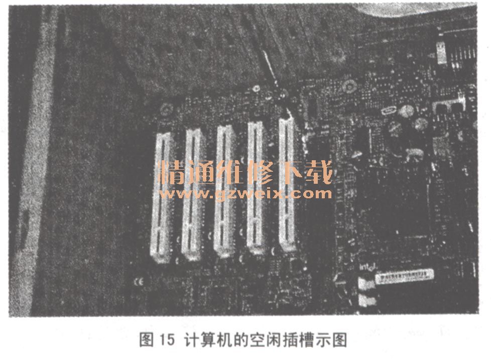 如果支持SCSI-II标准,采用32位数据总线,则同时连接的SCSI设备可多达32个。且SCSI数据连线的长度可以达到25 m,这也大大方便了外围设备的安装。图13为SCSI系统结构模型图扫描仪配备的SCSI卡及计算机的室闲插槽示图,扫描仪配备的SCSI卡及计算机的空闲插槽如图14、图15所示。