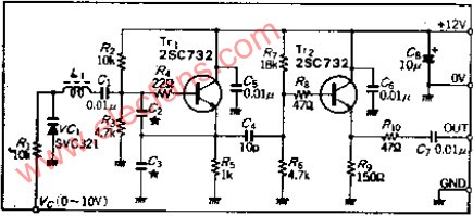 电容器C2、C3的作用是为晶体管的射极-基极间提供正反馈。振荡频率的电抗采用了数100欧的低阻值,目的是使TR1的参数变化对谐振回路不产生影响,这是本电路的特点。谐振频率随线圈L1、变容二极管的静电容的改变而变。