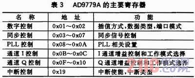 AD9779A内部有32个寄存器,每个寄存器8位,每位都有自己特定的功能。AD9779A的主要寄存器如表3所列。