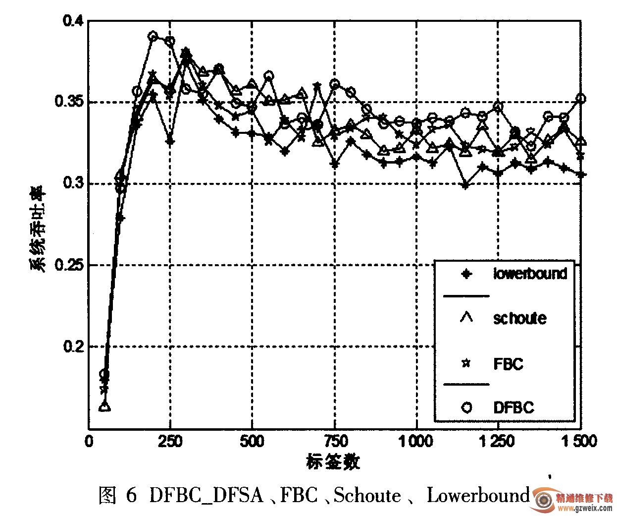 可以看到,此时尽管在某些标签数量情况下,DFBC方法的效率不及固定参数u的FBC效率,但是从整体效果上看,特别是当标签数目大于1 000后,DFBC方法的效率都有所提高,几乎都能围绕在0.35左右,系统的吐率表现更加稳定。