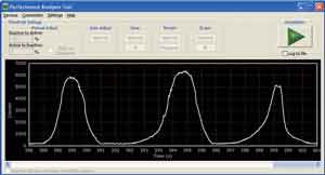 二维空间检测由位于不同位置的两个LED和单个光电二极管组成。从LED1得到一个测量值,然后快速从LED2获得另一个测量值,两个测量值被用于计算二维空间上的物体位置。其中,一维空间是接近LED1(左)或接近LED2(右),而另一维空间是接近或远离光电二极管。图3是与图2相同的三个方向运动检测结果。其中,白线代表从LED1中读出的数据,红线代表从LED2读出的数据。从左到右滑动过程中,白线上升,然后是红线。当手从左到右滑动时,LED1反射IR光到传感器,然后是LED2。
