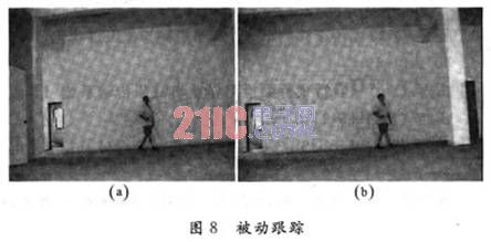 系统上电后,根据单个CCD摄像机视场测量方法,并通过实验证明,在6 m的范围内,视场边界线性一致,随着物距的增加,视场边界逐渐缩小,在12 m的地方出现2°的偏差,可近似认为视场边界线性。在此基础上分别来实现主动跟踪、被动跟踪,并将不同距离情况下跟踪效果进行比较,结果如图8和图9所示。