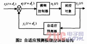 通过调节加热蒸汽量、风机转速、水蒸气量和天窗开度对温度和湿度进行控制,这两个参量的耦合性很强,需要一同控制。此控制是一个多变量控制系统,存在大滞后性、强耦合性,很难获得精确的数学模型。本文采用广义自适应预测与模糊控制相结合的控制算法,自适应预测技术预测温湿度一定时间后的状态情况,并将一定时间后的状态引入到当前控制中,提前对其进行控制,消除滞后性;考虑到温湿度在温室系统中耦合性较强,很难单独控制,利用模糊控制器制定规则表,对二者相互影响的效果进行反向消除,起到解耦作用。控制器的整体结构如图2所示。