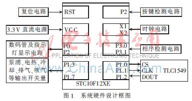 综合考虑产品成本、系统性能等因素,模温机控制器选用宏晶科技公司生产的STC10F12XE作为微控制器。STC10F12XE属于STC11/10xx系列单片机,工作在单机器周期下,指令代码完全兼容传统的8051,速度却快了8~12倍,有效保证了系统控制的实时性,并具有低功耗和超强抗干扰的优点,同时芯片内部还集成了12 KB的Flash程序存储器、512 KB的SRAM以及1 KB的EEPROM,足以存放实现复杂控制算法的程序代码以及系统运行所需的相关参数,完全能够胜任本系统工业智能控制的应用场合。围绕STC10F12XE设计硬件系统,模温机控制器主要由以下几个部分组成:电源电路、复位电路、时钟电路、显示电路、温度采集电路、按键检测电路、相位检测电路等,如图1所示。