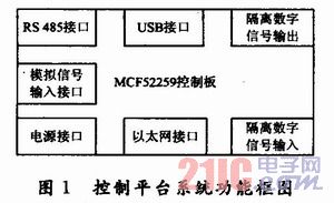 该控制平台主要由以下部分组成,MCF52259控制器、RS 485接口、USB接口、隔离数字信号输出/输入接口、以太网口、模拟信号输入接口及电源接口。