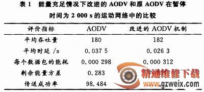 在实际应用场景中,即雷场中,暂停时间为2 000 s比较具有代表性,即结点的平均移动速度大约为0.5 m/s。表1给出了在暂停时间为2000s的运动网络中,改进的AODV和原AODV在性能上比较。可以清楚看到在此条件下,平均吞吐量基本没有变化,平均延时降低了29.9%,剩余能量方差降低了11.3%,发送成功率提高了0.7%,其中每个数据包消耗的能量提高了。每个数据包消耗能量的增加主要是因为在结点能量充足的阶段,采用了总体路由能量最小的路由选择算法,没有采取任何广播控制和能量节省算法所致,这是改进的AODV机制中需要付出的代价,但是在能量充足的情况下,这一点消耗能量的增加并不会影响网络整体的工作寿命,而且达到了降低数据传输时延的目的,这正是希望看到的。