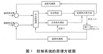 加热系统主要由蓄热水箱、太阳能集热板、电加热器、中央控制器、电磁阀、电磁继电器等构成。控制系统的原理方框图如图 1 所示。
