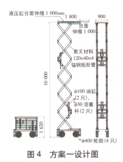 方案一设计图如图4所示。该方案以剪式升降平台车为基础,平台设计为可伸缩液压缸台面(台面根据需要安装一定数量的滚轮,方便